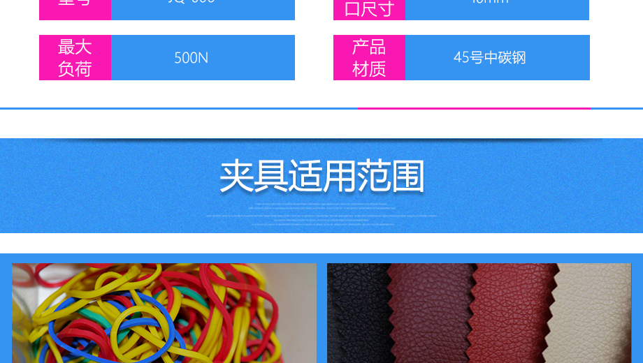 產品型號:JQ-006 品牌:劍 喬 用途:端子扎帶拉伸夾具適用范圍: 橡膠、線纜、紙張、電器元件、塑料薄膜等材料的拉力、破壞力、插撥力的測試。