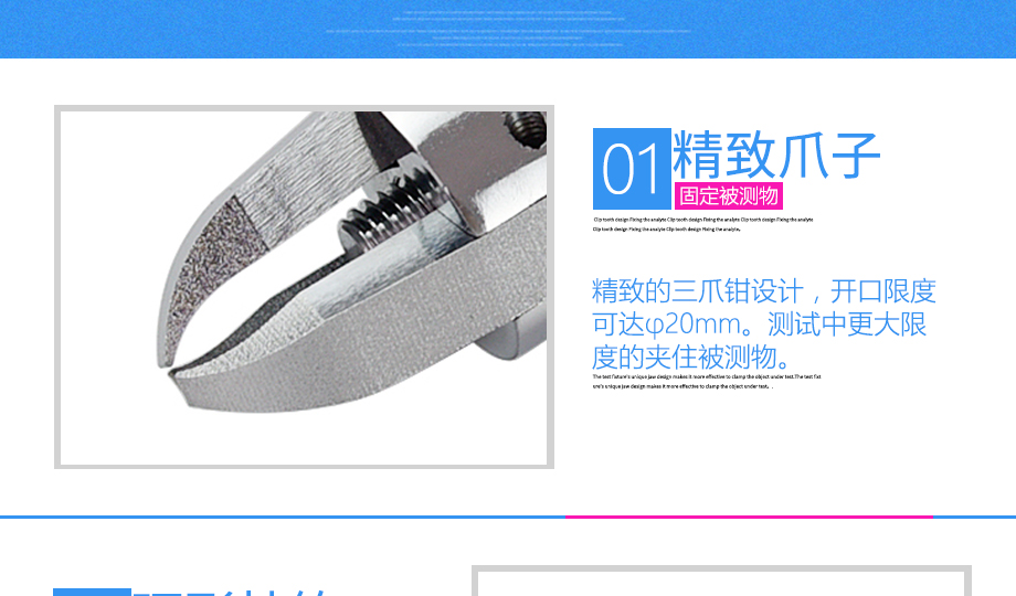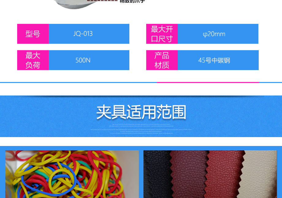 產(chǎn)品型號(hào):JQ-013 品牌:劍 喬 用途:三爪鉗夾具適用范圍:橡膠、各種線纜、紙、各種電器元件、塑料薄膜等材料的拉力,破壞力測(cè)試。